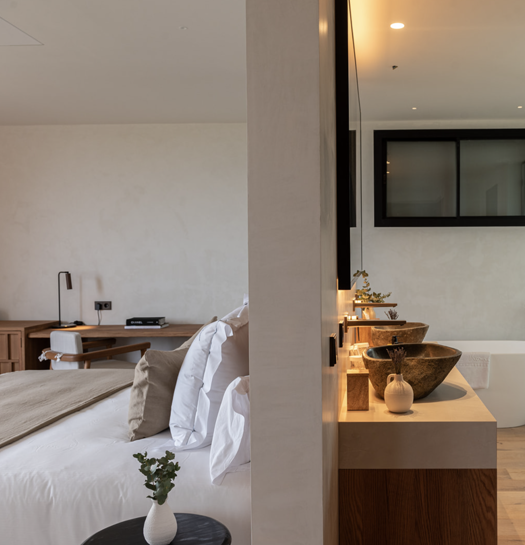 At the front of the villa, on the first floor, suite 6 offers captivating sea views. A triple-width terrace runs along the bedroom, bathroom and living room, connecting this sublime suite with its magical natural setting.